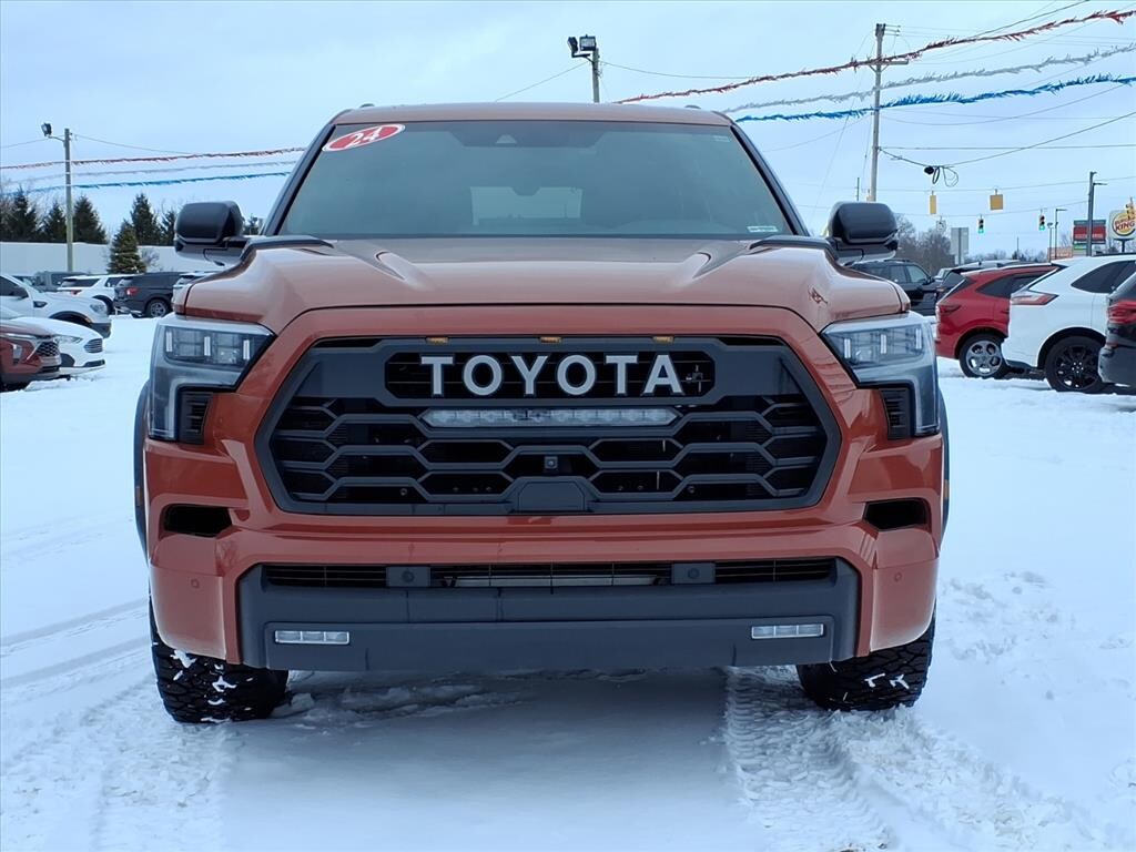 This vehicle is a 2024 Toyota Sequoia TRD Pro SUV 4x4 with a brown exterior and 52,511 miles. It has a 3.4 liter 6 cylinder engine and a fuel economy of 19 mpg in the city and 22 mpg on the highway. Vehicle features include blind spot sensor, hill start assist, part time four wheel drive, navigation system with voice recognition, and touch screen display. This car is sure to turn heads on the road with its stylish exterior and impressive performance. Contact Details: C. Wimberley Ford Inc., 56081 M-51 S, Dowagiac, MI, 49047, dallasw@cwautomall.com, (269) 782-2151.